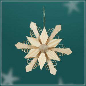 Aus Ihrem wunderbaren Weihnachtsstrauß können sie mit tollem Baumbehang noch mehr machen. Dieser schöne Holzstern hat eine Durchmesser vom 11 cm, ist komplett aus Lindenholz gefertigt und kann mit einem Faden am Baum aufgehängt werden. In der Mitte hat er eine kleine Nabe, wo sich außen ein kleiner 6-eckiger Holzstern und 6 Spambaumecken vereinen. Die Spanbäume werden alle einzeln per Hand mit einem scharfen Eisen gestochen. Mit dem Eisen werden von einem Holzstab Späne abgezogen, bis sie sich wie Locken am Holzstab aufstellen.