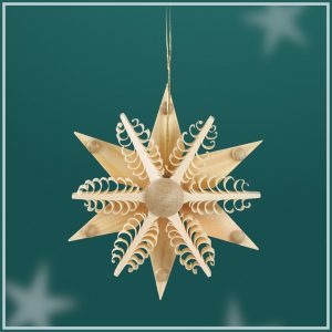 Aus Ihrem wunderbaren Weihnachtsstrauß können sie mit tollem Baumbehang noch mehr machen. Dieser schöne 6-eckige helle Holzstern mit braunen Punkten hat eine Durchmesser von 8 cm, ist komplett aus Lindenholz gefertigt und kann mit einem Faden am Baum aufgehängt werden. In der Mitte hat er eine Nabe mit 6 Spanbäumen. Die Spanbäume werden alle einzeln per Hand mit einem scharfen Eisen gestochen. Mit dem Eisen werden von einem Holzstab Späne abgezogen, bis sie sich wie Locken am Holzstab aufstellen.