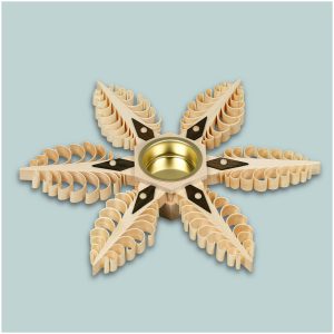 Machen Sie noch mehr aus Ihrer Tischdeko – zum Beispiel mit einem schönen Kerzenhalter. Dieser tolle Kerzenhalter hat eine Länge vom 12,5 cm und ist komplett aus Holz gefertigt. Der Sockel in natur hat eine Tülle mit einem Durchmesser von 4 cm für eine normale Kerze. Auf der einen Seite hat er einen kleinen Spanstern bestehend aus 6 kleinen Spanbäumchen. Die Spanbäume werden alle einzeln per Hand mit einem scharfen Eisen gestochen. Mit dem Eisen werden von einem Holzstab Späne abgezogen, bis sie sich wie Locken am Holzstab aufstellen.
