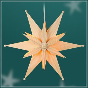 Dieser schöne Spanstern ist der perfekte Schmuck für Ihre Fenster. Er hat einen Durchmesser vom 32 cm und ist komplett aus Lindenholz gefertigt. In der Mitte hat er eine Nabe mit einem kleinen Spanbäumchen und einer elektrischen Beleuchtung (220 V). An ihr verbinden sich 6 große Spanbäume zum Stern. Die Spanbäume werden alle einzeln per Hand mit einem scharfen Eisen gestochen. Mit dem scharfen Eisen werden von einem Holzstab Späne abgezogen, bis sie sich wie Locken am Holzstab aufstellen.