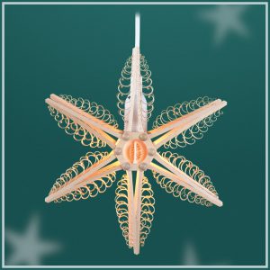 Dieser schöne Spanstern ist der perfekte Schmuck für Ihre Fenster. Er hat einen Durchmesser vom 24 cm und ist komplett aus Lindenholz gefertigt. In der Mitte hat er eine Nabe mit einer elektrischen Beleuchtung (220 V). An ihr verbinden sich auf 2 Ebenen 6 kleine und 6 große Spanbäume zum Stern. Die Spanbäume werden alle einzeln per Hand mit einem scharfen Eisen gestochen. Mit dem scharfen Eisen werden von einem Holzstab Späne abgezogen, bis sie sich wie Locken am Holzstab aufstellen.